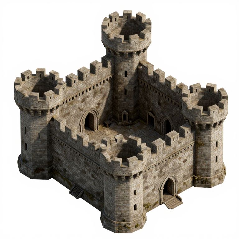 Photorealistic CGI rendering of a medieval stone castle with four tall, crenellated towers, arched windows, and a central entrance.