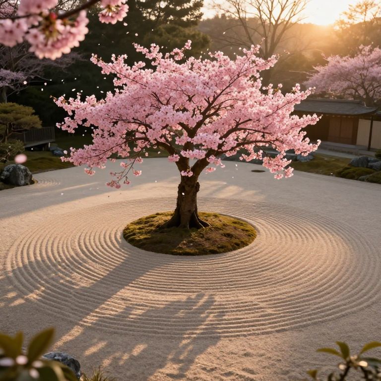 Envision an idyllic Japanese zen garden viewed from above, with meticulously raked sand resembling ocean waves. At its heart, a solitary cherry blossom tree stands majestically alone, its branches adorned with luminous pink petals that gracefully flutter in the soft breeze. Bathed in the warm, golden light of sunset, this tranquil oasis exudes an atmosphere of serenity and introspection as elongated shadows stretch across the garden landscape, highlighting the delicate interplay between nature's ephemeral beauty and the inexorable march of time through the fleeting blooms and ever-changing illumination.