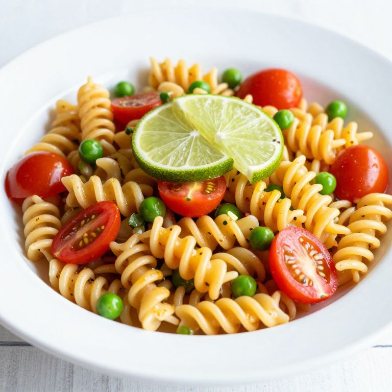 Vibrant Mexican Pasta Salad featuring spiral-shaped pasta mixed with halved cherry tomatoes, green peas, and lime slices garnished on top, served in a pristine white bowl.