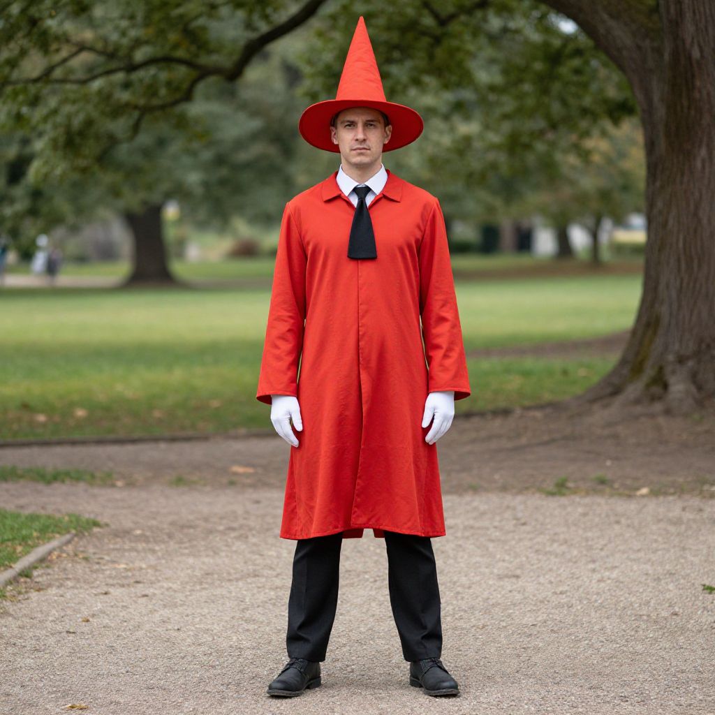 Toto Wizard Costume, man in a red hat and red coat standing in a park