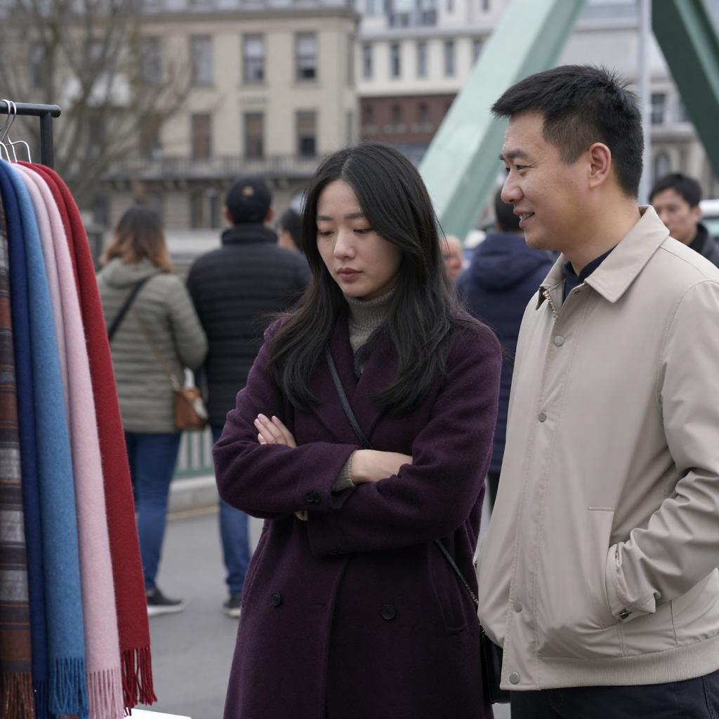 Photograph of an urban bridge scene. A young woman with long black hair, wearing a dark purple coat, stands with arms crossed, looking down. A man with short black hair, wearing a beige jacket, stands to her right, smiling. Both are near a rack of colorful scarves. Background includes a crowd of people, buildings, and a green bridge.
