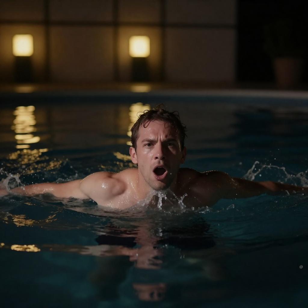 A young man with short brown hair partially submerged in a dark, reflective swimming pool at night. He is lying on his stomach with arms extended, mouth open in a gasp, and water splashing around him. The background features a dimly lit wall with warm yellow lights creating a moody, dramatic atmosphere.