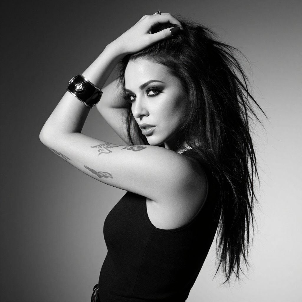 A black and white photo of a striking woman with long, messy dark hair, looking over her shoulder. She's wearing a sleeveless black top and a thick black bracelet on her right wrist. Her left arm, adorned with a detailed skull tattoo, is raised, her hand running through her hair. She has dark, dramatic eye makeup and a confident expression. The background is a gradient from dark to light gray.