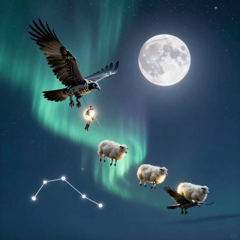 Mechanical hawks soar through the ethereal glow of auroras, carrying moon-herders who guide a luminous flock of celestial sheep beneath a radiant full moon, their journey forming constellations that echo forgotten melodies in the starlit sky.