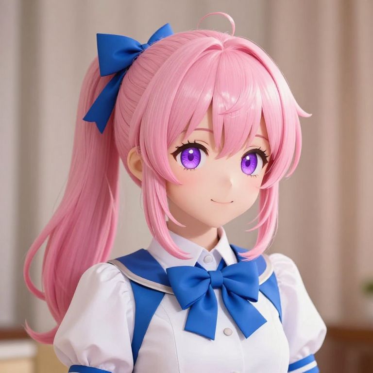 Digital anime-style portrait of a cute, pink-haired girl with purple eyes, wearing a white and blue school uniform with blue bows, smiling slightly. Background
