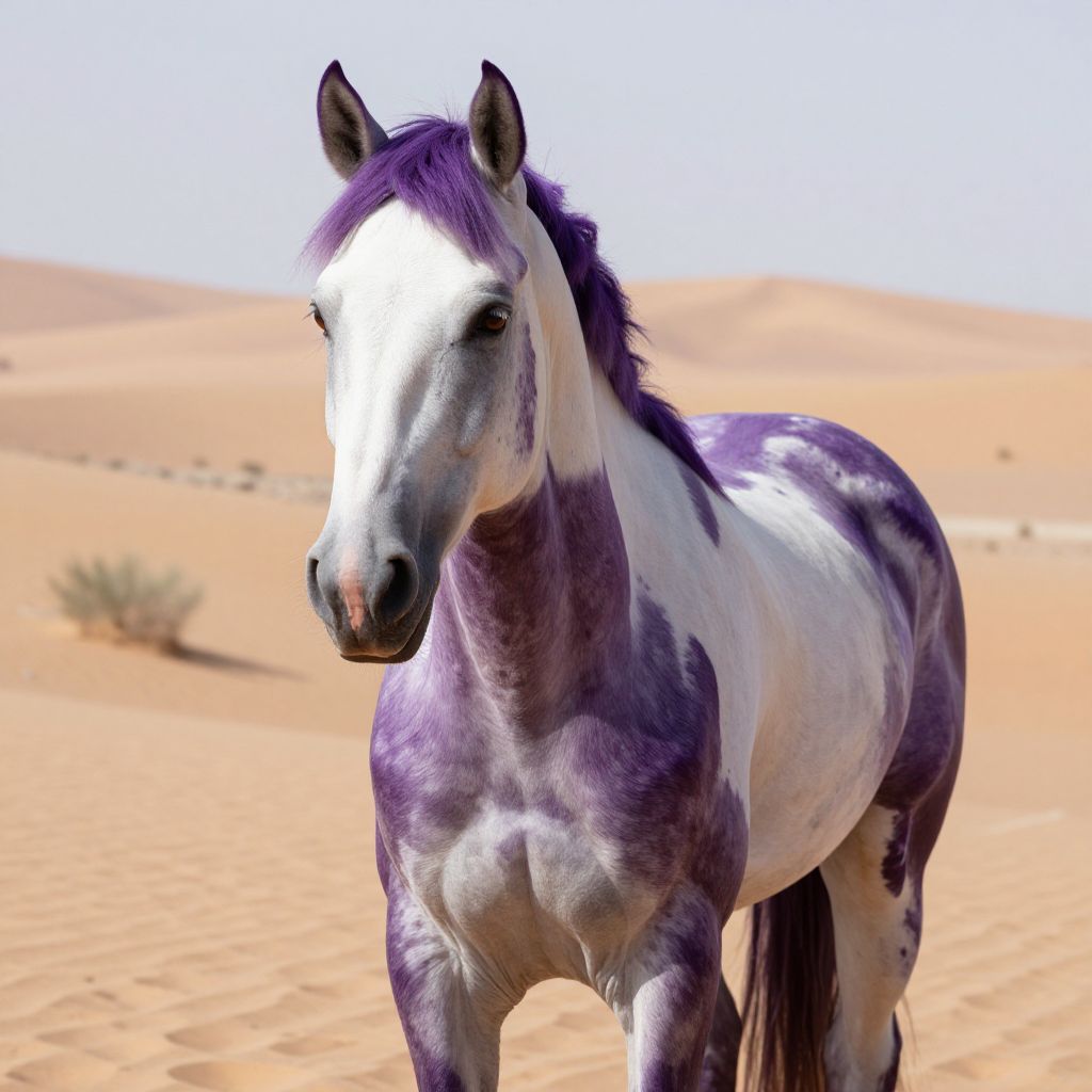 The image showcases a strikingly beautiful horse with a unique spotted coat, standing in a desert landscape. The horse's coat is a mesmerizing blend of white and purple, adorned with large, irregularly shaped spots that create a captivating pattern. Its mane and tail are a striking shade of purple, adding to the overall elegance of its appearance. The horse's ears are pointed and alert, and its eyes are a warm, inviting brown. The background features a vast expanse of sandy dunes and sparse desert vegetation, creating a stark contrast with the horse's vibrant coat. The composition places the horse centrally, drawing the viewer's attention to its intricate markings and the serene desert environment.