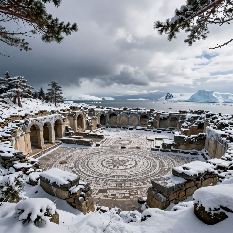 Ancient ruins in Antarctica, sprawling archaeological site with intricate stone mosaics and half-collapsed arches coated in ice, framed by snow-laden pine trees and a dramatic cloudy sky