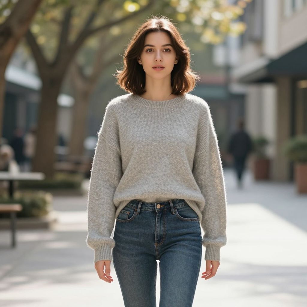 A young woman in her late 20s with warm brown eyes and soft blonde hair wearing a contemporary, on-trend oversized sweater and high-waisted denim pants standing in a sunny city street, surrounded by modern street fashion signs and minimalist architecture, capturing the essence of current style trends.