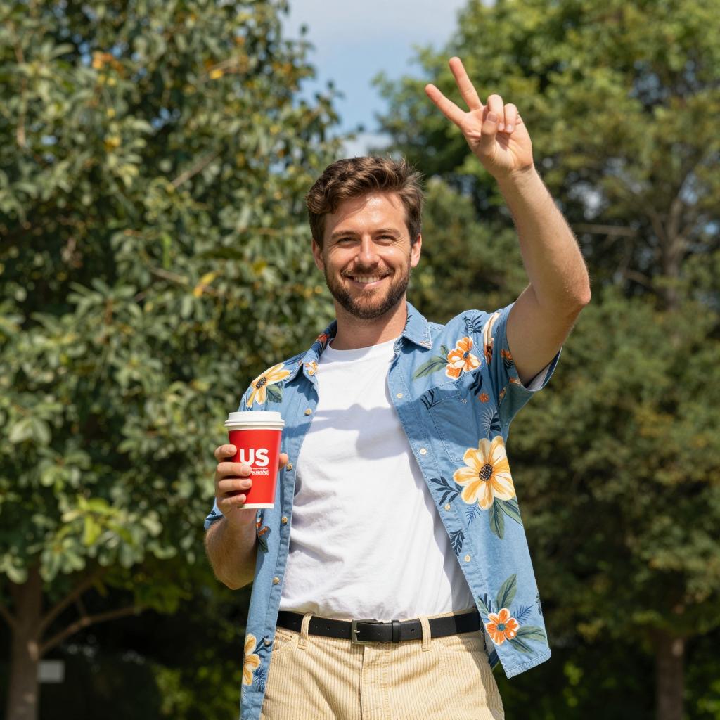 A smiling man with short brown hair wears a blue floral shirt, white t-shirt, and yellow striped pants. He holds a red "US Beverage" cup in his right hand and makes a peace sign with his left hand. He stands among lush green trees under a blue sky. His right arm is raised, and his left arm extends forward. He wears a black belt. The man is the central figure, positioned slightly to the right.