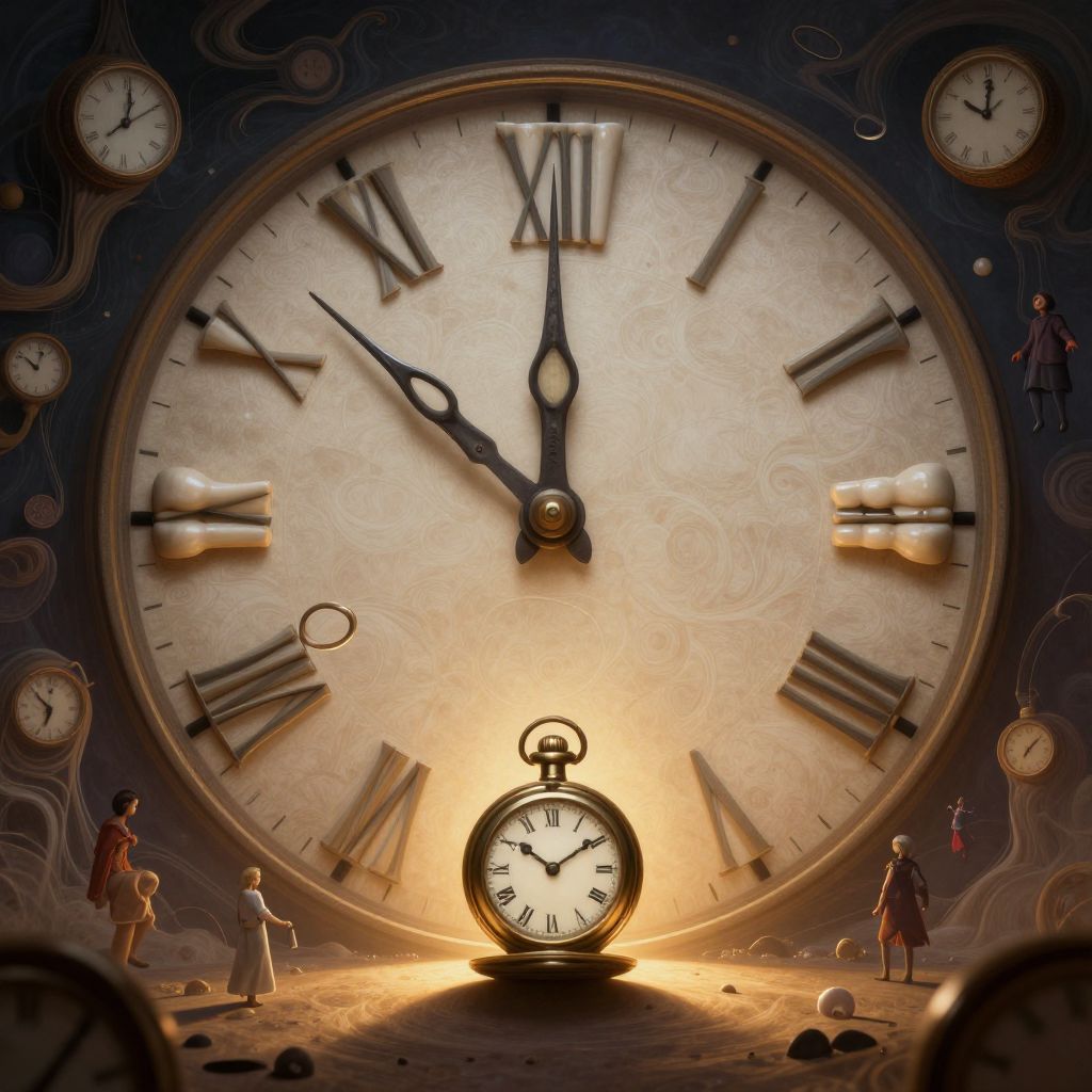 In the vein of surreal dreamscapes, create an arresting close-up of a colossal clock face meticulously crafted from human teeth, with hour and minute hands sculpted from curved shears. This enigmatic scene unfolds against a fantastical backdrop where clocks dissolve into abstract forms and ethereal figures drift weightlessly. Soft golden light radiates from a monumental pocket watch below, casting elongated shadows that accentuate the dreamlike ambiance. The resulting image should stir intrigue and unease, guiding viewers through a visual tale that questions our perception of time and reality in a thought-provoking manner.