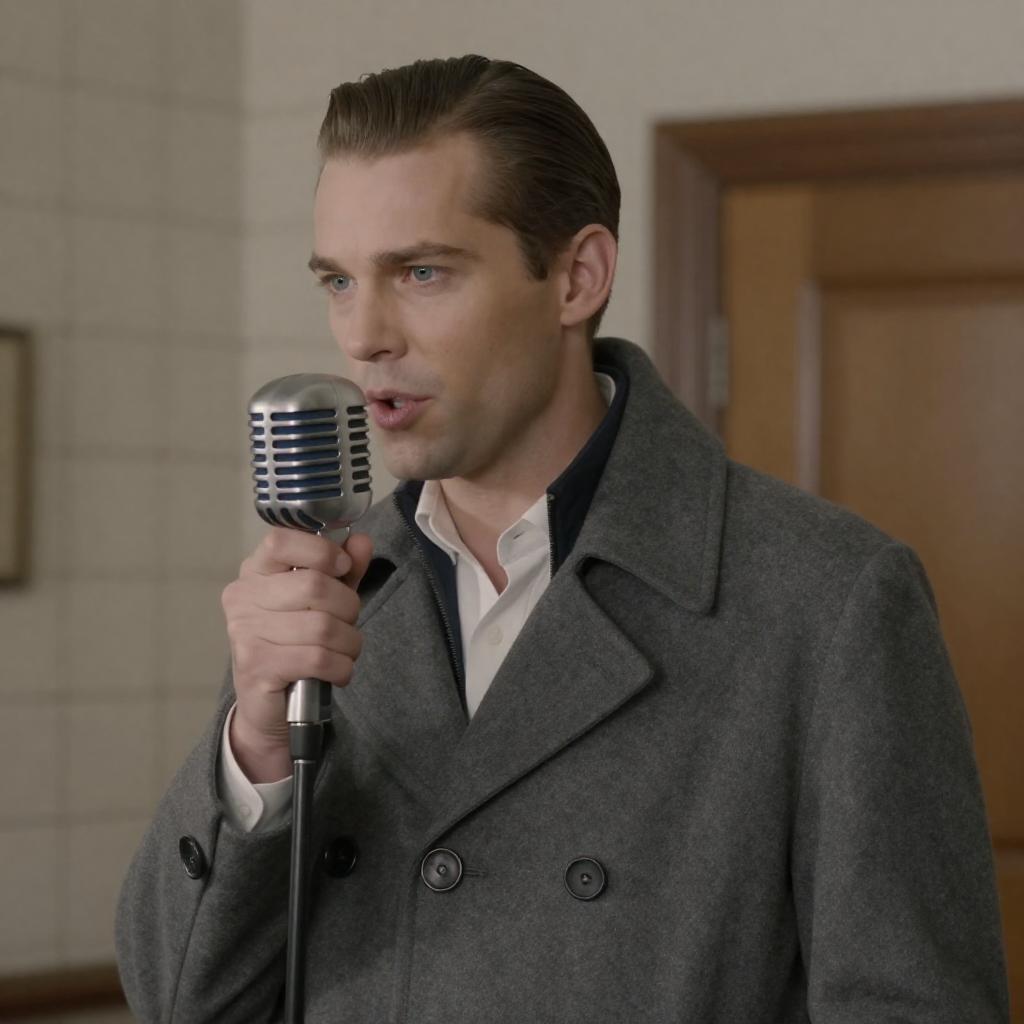 Mid-shot of a man with slicked-back brown hair wearing a gray wool coat over a white shirt. He is holding a vintage silver microphone close to his mouth, speaking with a focused expression. The background features tiled walls and a wooden door, suggesting an indoor setting.