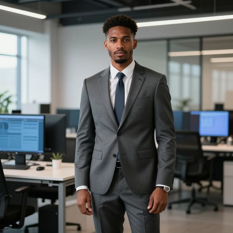 Handsome salt and pepper beard black man standing confidently in a modern urban setting, wearing a tailored suit and glasses, natural lighting highlighting his textured hair and confident expression, cinematic portrait style.