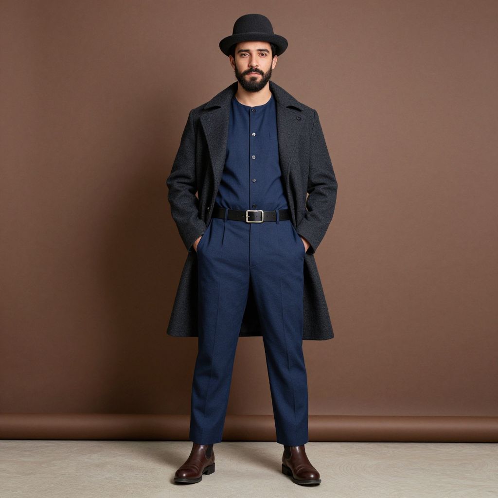 Foot wear man costume, 1boy, male focus, solo, facial hair, hands in pockets, mustache, black hair, boots, brown footwear, hat, standing, pants, full body, beard, looking at viewer, indoors, blue pants, belt, coat, jacket