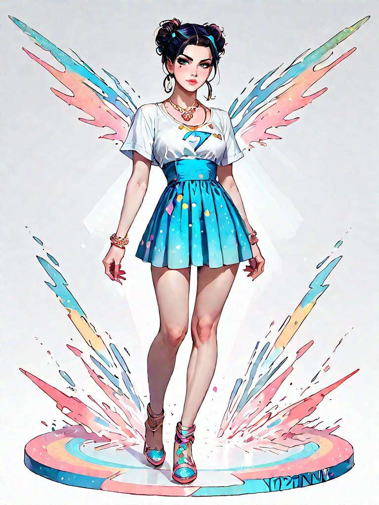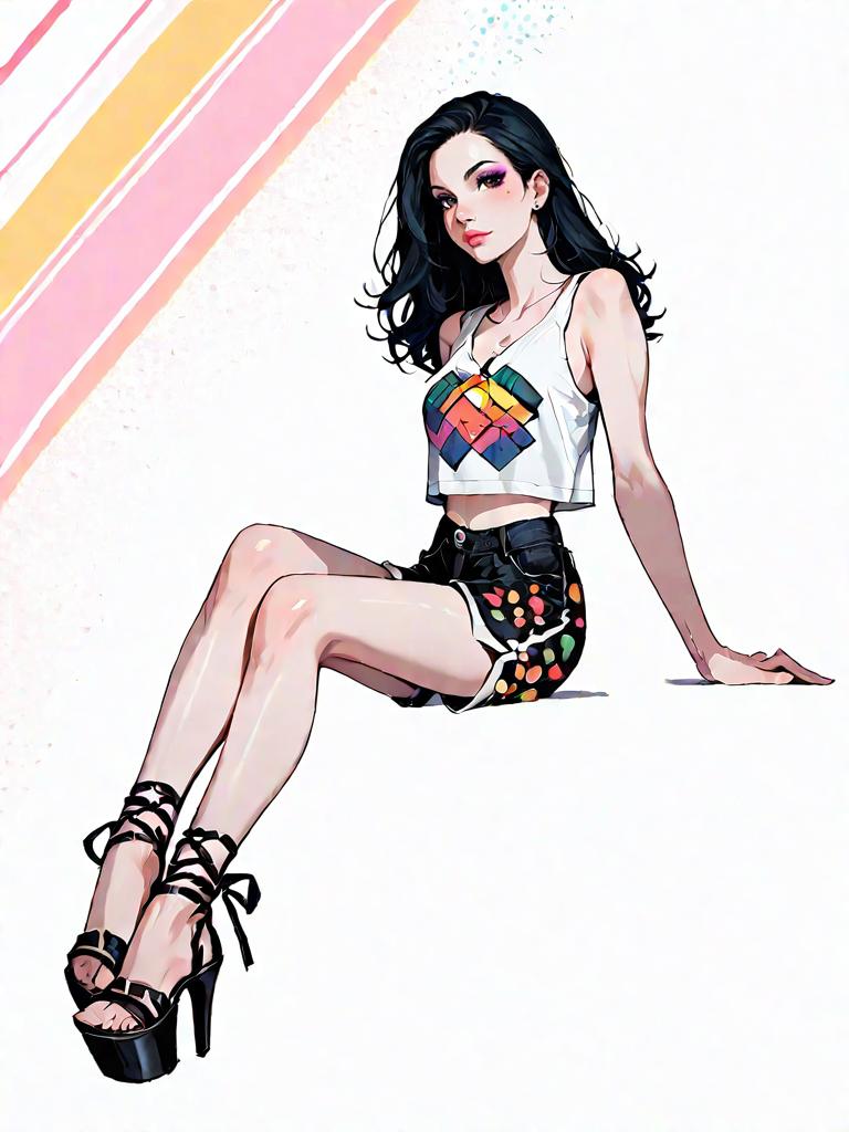 Digital illustration of a young woman in a full body shot, featuring modern party fashion with a metallic magenta crop top and matching high-waisted mini skirt in shiny satin-like material. She has medium-length dark purple hair and is holding two dripping, colorful spherical objects resembling pom-poms or futuristic accessories. She wears high platform shoes that match her outfit, set against a white background.