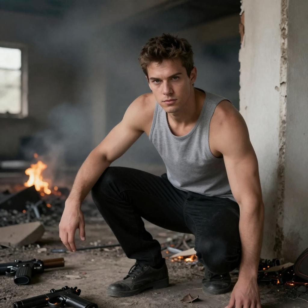 Photograph of a young white man with short brown hair, intense expression, holding a black gun over his right shoulder. He wears a black jacket and gray shirt. Background is a ured, blue-gray sky with debris and small explosions. His left cheek is slightly flushed.