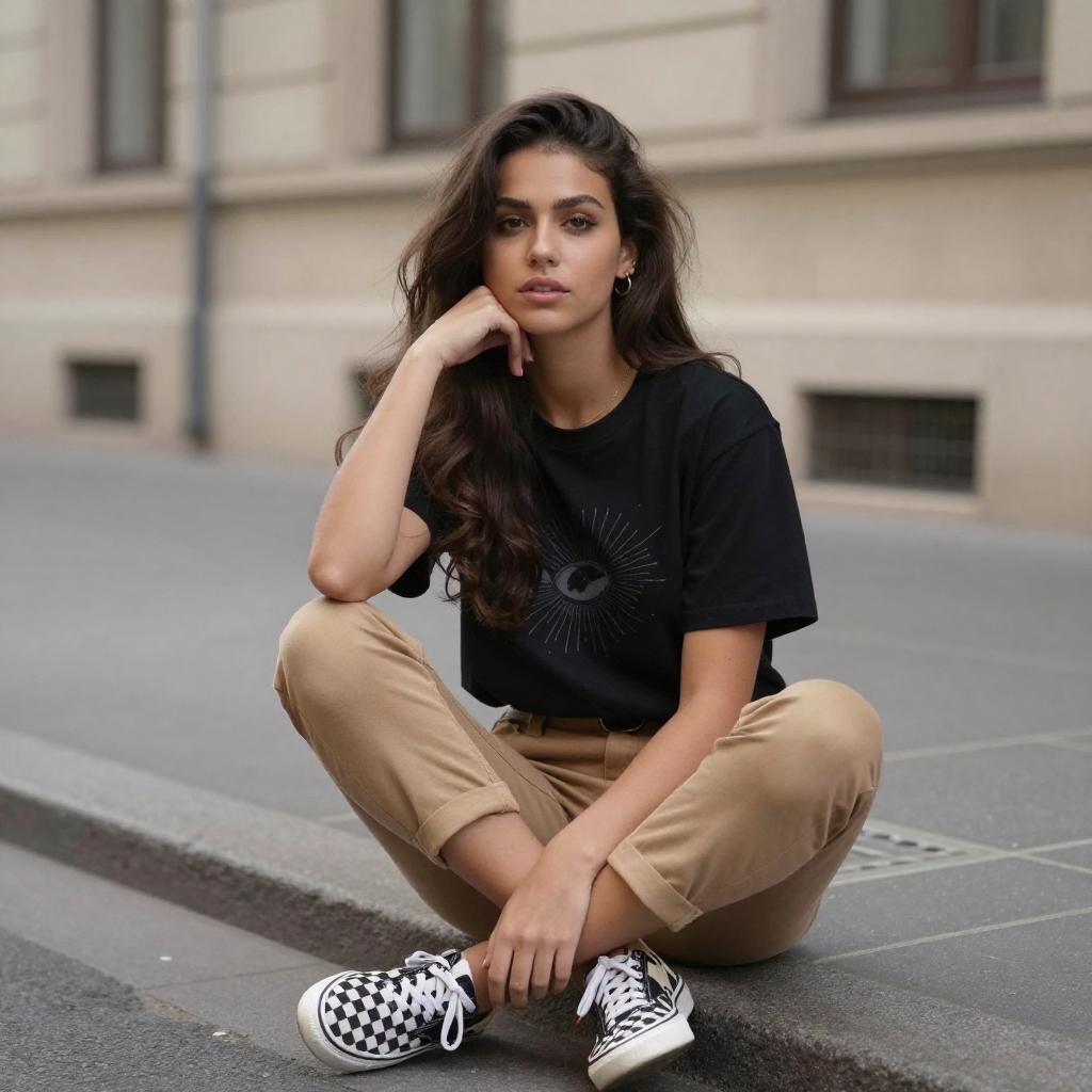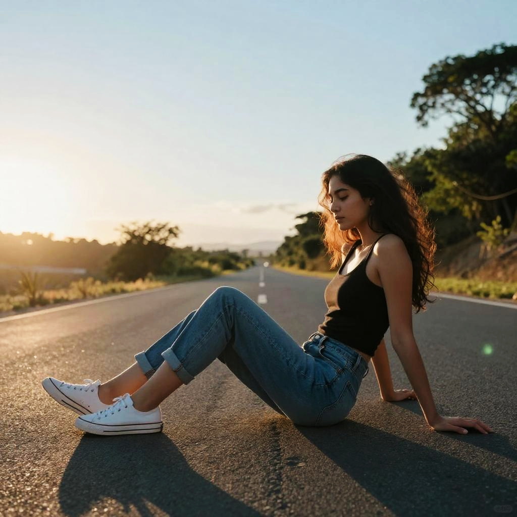 Photograph of a young woman with long, straight black hair sitting on a city street. She's wearing a tight, orange t-shirt and ripped, light blue jeans with white sneakers. She's sitting with her legs spread and one hand in her hair, looking slightly to the side. The background is slightly blurred, showing a street with buildings and traffic lights. The overall vibe is casual and urban.