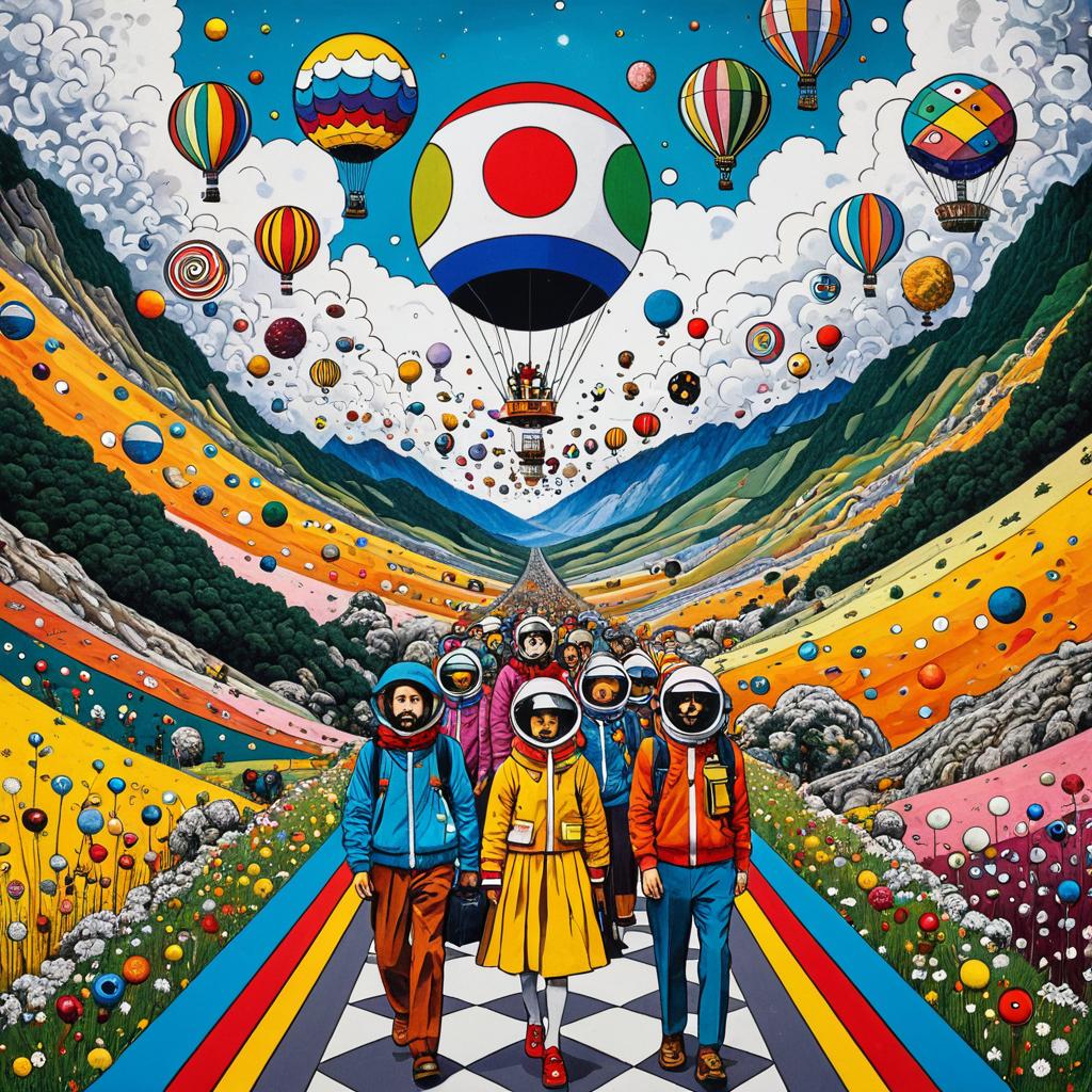 Surrealism-infused travel scene featuring cosmic travelers with colorful clothes and abstract faces, vibrant landscape, cheerful expressions, painted in the style of Takashi Murakami, Escher, Egon Schiele