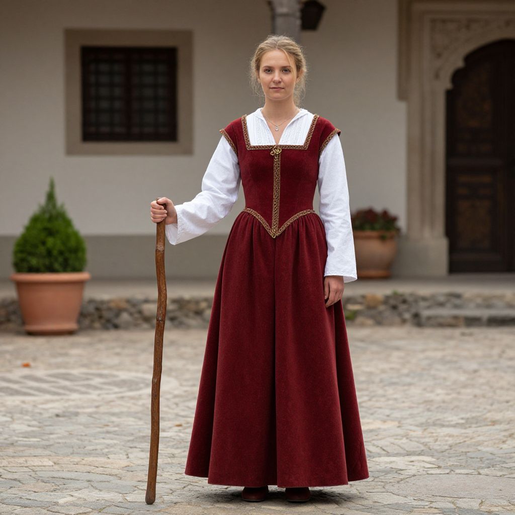Traditional European Clothing, woman in medieval dress holding a wooden stick in a courtyard