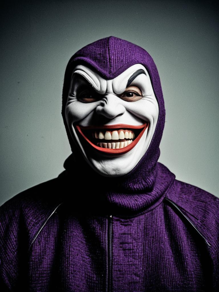 Photorealistic detailed studio portrait of a person wearing a Grimace costume mask featuring a large purple head, thick black eyebrows, a red clown nose, and a wide smile with prominent teeth. The subject is dressed in a purple textured garment.