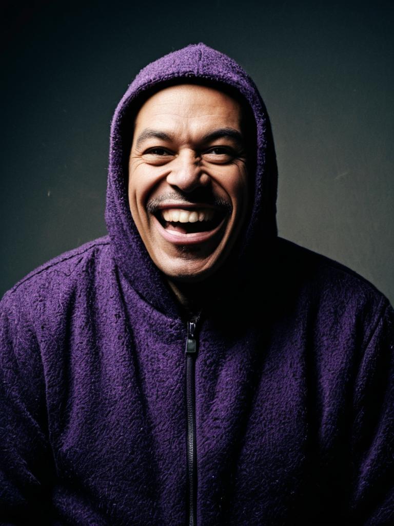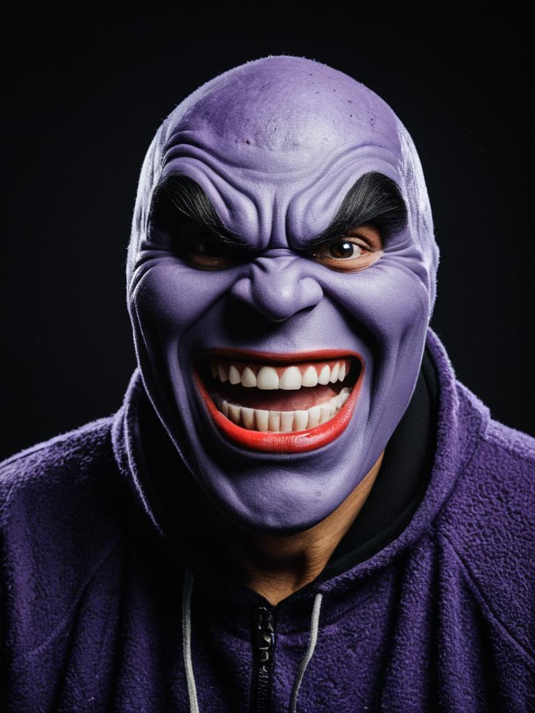 Man in Grimace Costume, photorealistic detailed studio portrait