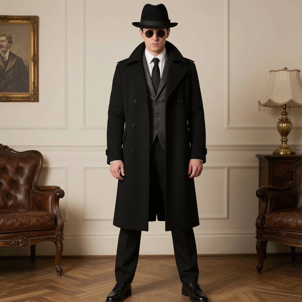 Modern Gangster Costume, man in a coat and hat standing in a room