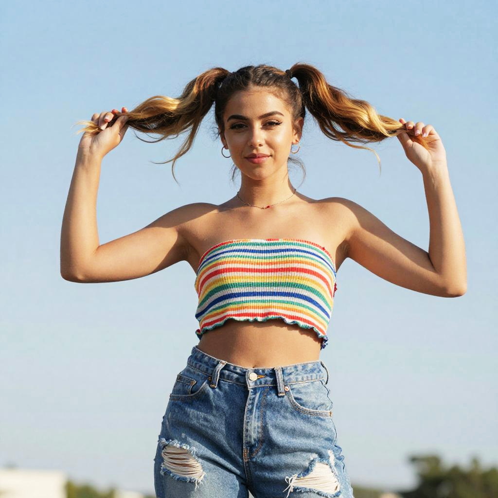 A young woman poses confidently outdoors, wearing a colorful striped tube top and distressed blue jeans. Her hair, styled in vibrant ombré ponytails, is playfully lifted as she holds it behind her head against a bright, clear sky backdrop.