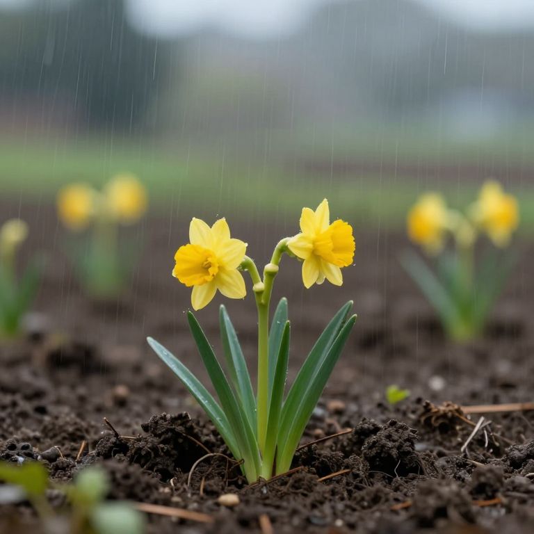 Photograph of two vibrant yellow daffodil flowers with six petals each, standing tall in dark, moist soil. The flowers have green, elongated leaves and are slightly tilted to the right. Raindrops are visible, adding a sense of freshness and movement. The blurred background features more daffodils and a green, grassy field, with a soft, overcast sky. The image captures the delicate beauty and resilience of the flowers amidst a gentle rain shower.