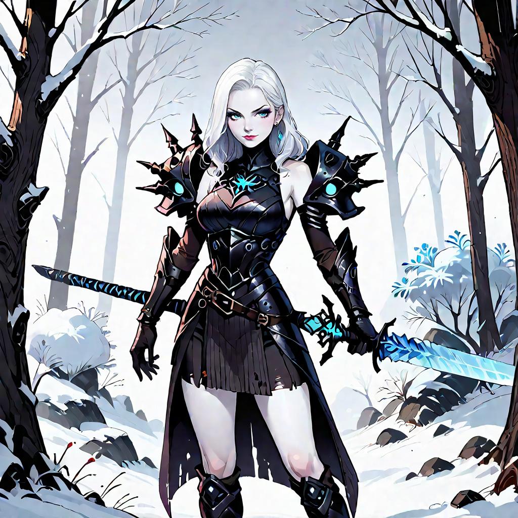 Score_9, score_8_up, score_7_up, source_anime, solo, cowboy shot, HKStyle (vl4dil3n4:1.1), corrupted, (pale skin:1.1), lich, white hair, blue eyes, glowing eyes, undead, black boots, black gloves, black armor, dark armor, bare shoulders, standing, holding ice sword, cruel smile, fallen to evil, (large breasts, thighs:0.8), winter, snow, tree
