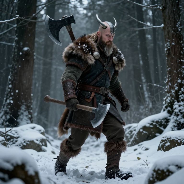 Serif limping viking with big axes, 1 axe on back, dark forest, snow, winter, fur armor, ancient, mythic, fantasy rpg style,