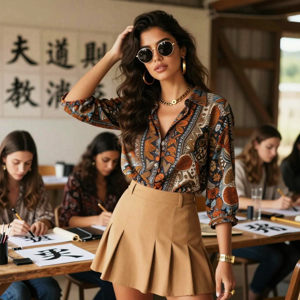 A woman, in a toei animation style, wearing a cognac satin wrap blouse with a V-neckline and long sleeves, tied at the waist, paired with high-waisted black faux leather pants and oversized black sunglasses. She accessorizes with layered necklaces, including a choker and a mid-length pendant, holding a white leather handbag with a chain strap, standing by an ancient ruin. Sexy. Pretty face and beutiful eyes