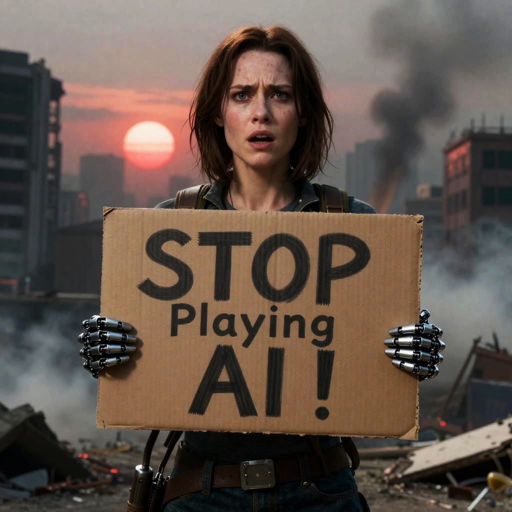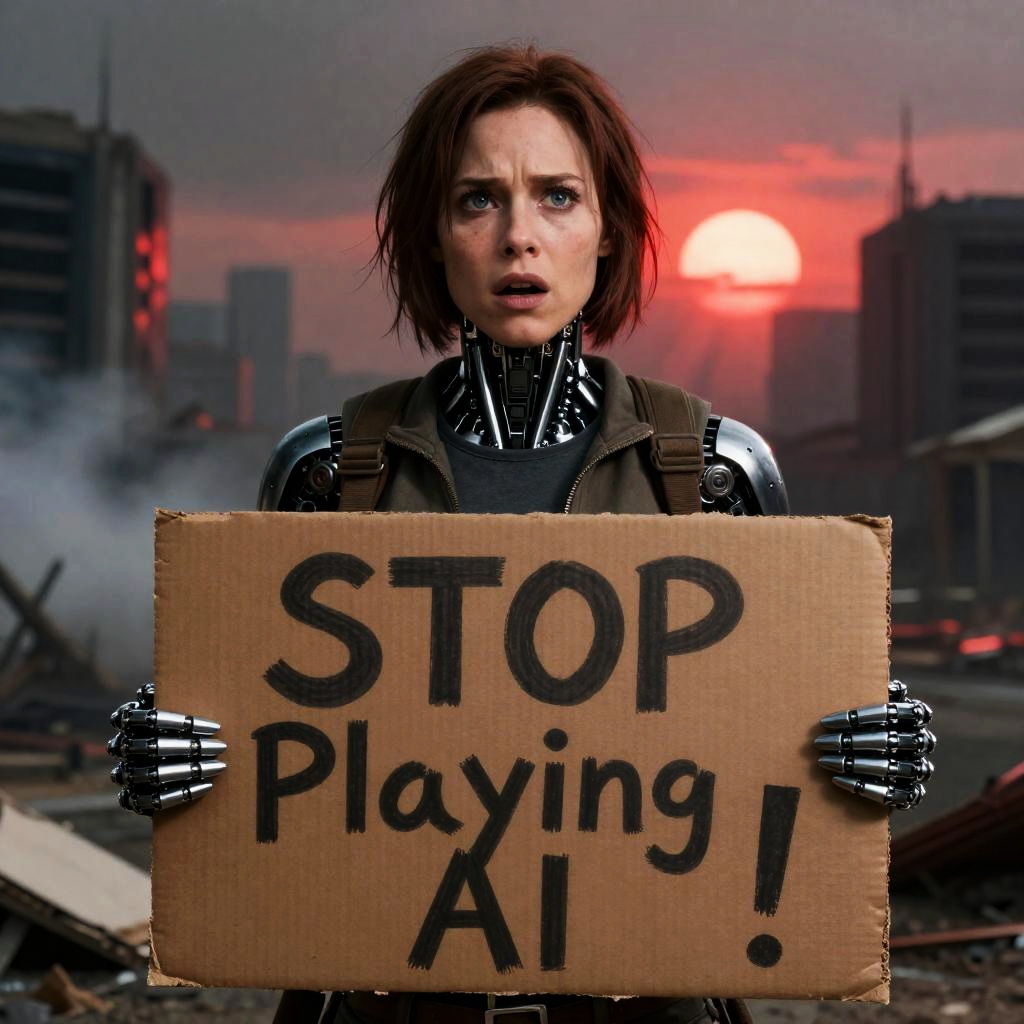 A young woman with short brown hair and a distressed expression stands in a destroyed post-apocalyptic urban setting. She wears casual clothing with a belt and has bionic metal hands. She holds a cardboard sign that reads 'STOP Playing AI!' with a dramatic sky, smoke rising from buildings, and a red sun in the hazy background.