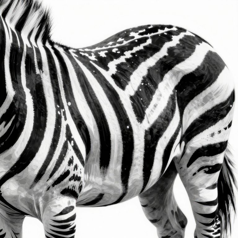 Black-and-white digital drawing of a zebra's side, showcasing bold, contrasting stripes with textured, brushstroke-style rendering on a white background.