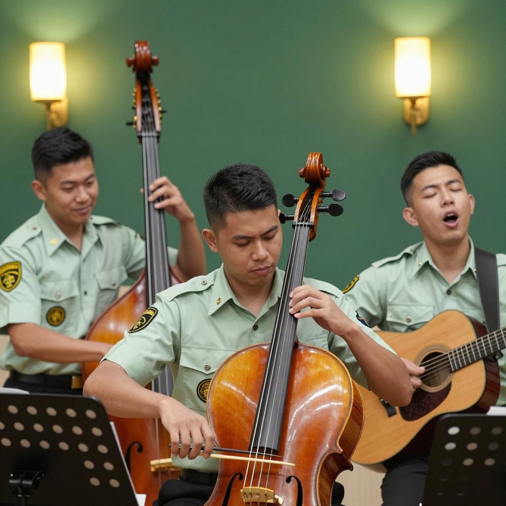 Photograph of a man with dark hair, wearing a gray military-style shirt, playing an acoustic guitar. He smiles slightly. Background has a wooden door with a red, white-patterned curtain. Man's right hand on guitar neck, left hand on strings. Wooden door handle on right. Gray shirt with insignia on left sleeve.