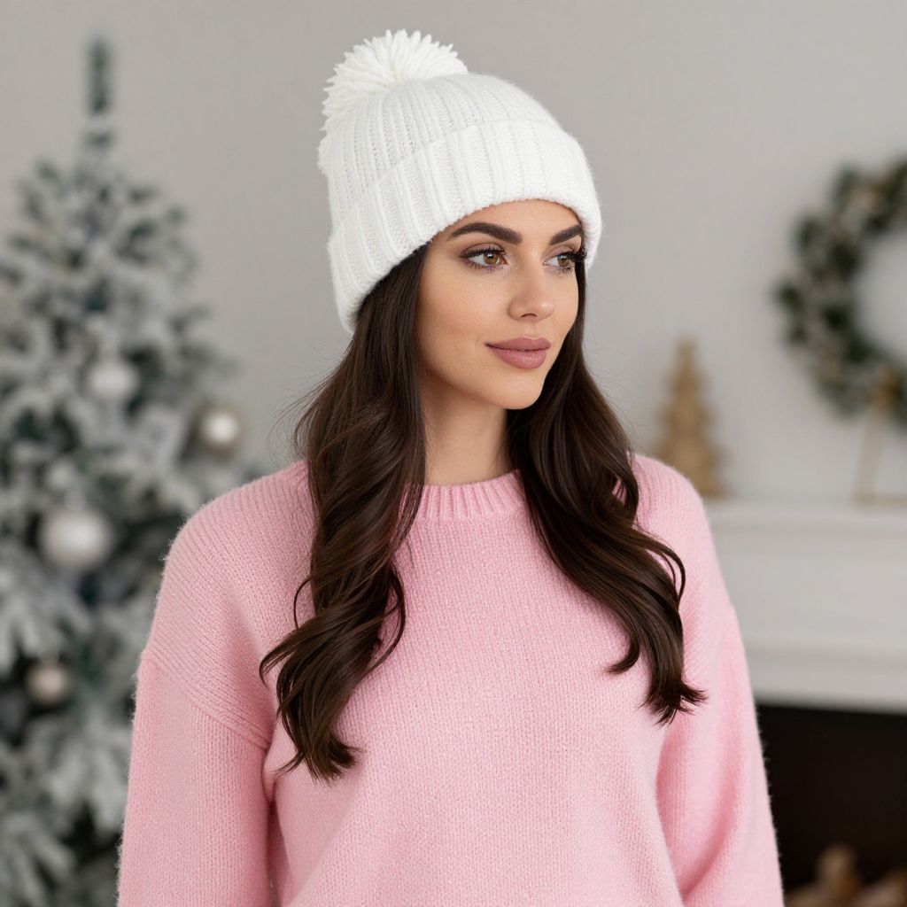 Subtle Christmas Outfit Costume, woman wearing a pink sweater and a white knitted hat