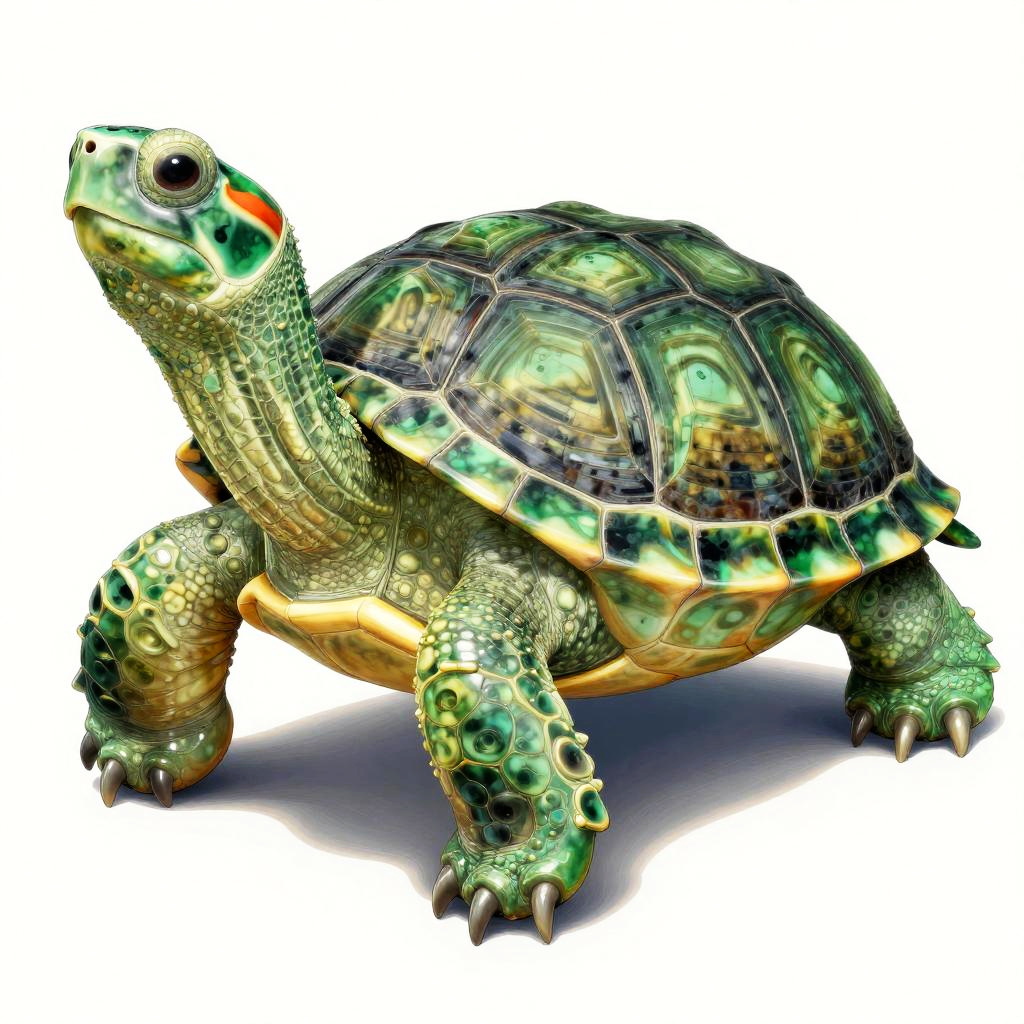 Highly detailed portrait of a tranquil jade turtle in emerald green tone, inspired by Audrey Kawasaki, Takashi Murakami, Eyvind Earle.