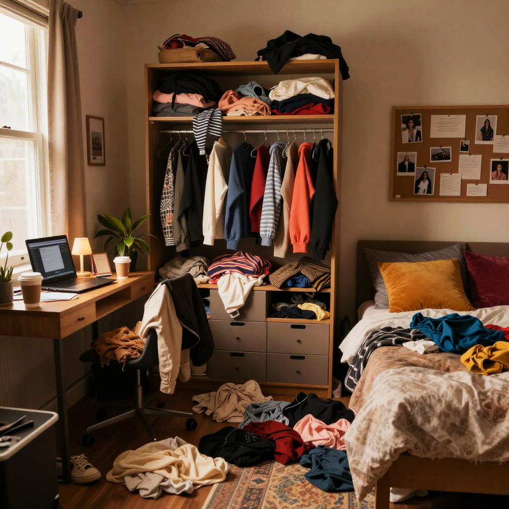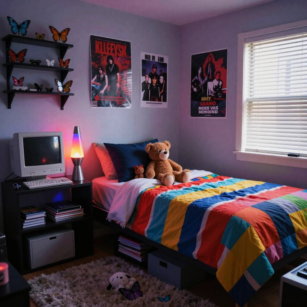 90s style bedroom filled with typical decor: butterfly clips on shelves, old desktop computer, posters of grunge bands, stuffed animals on a twin bed with bright geometric bedspread, lava lamps casting multicolored light, shag carpet, window with blinds partially open