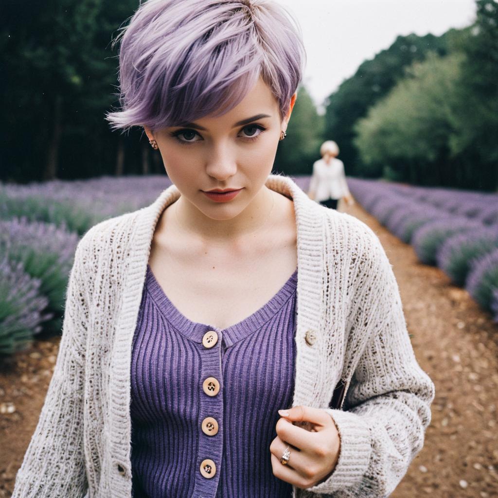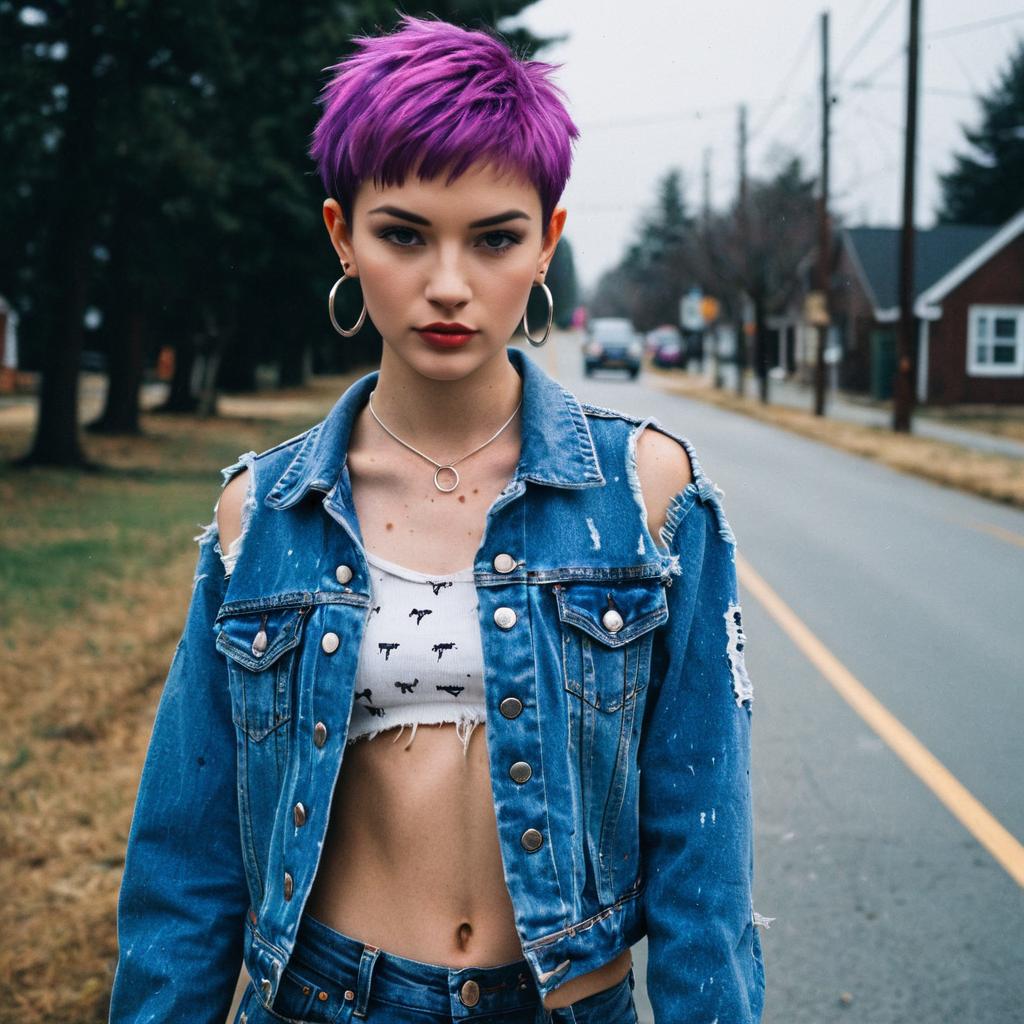 Girl with shimmering silver hair, revealing graceful neck, with bold lipstick and a quirky headband, wearing a playful romper, walking with a terrier