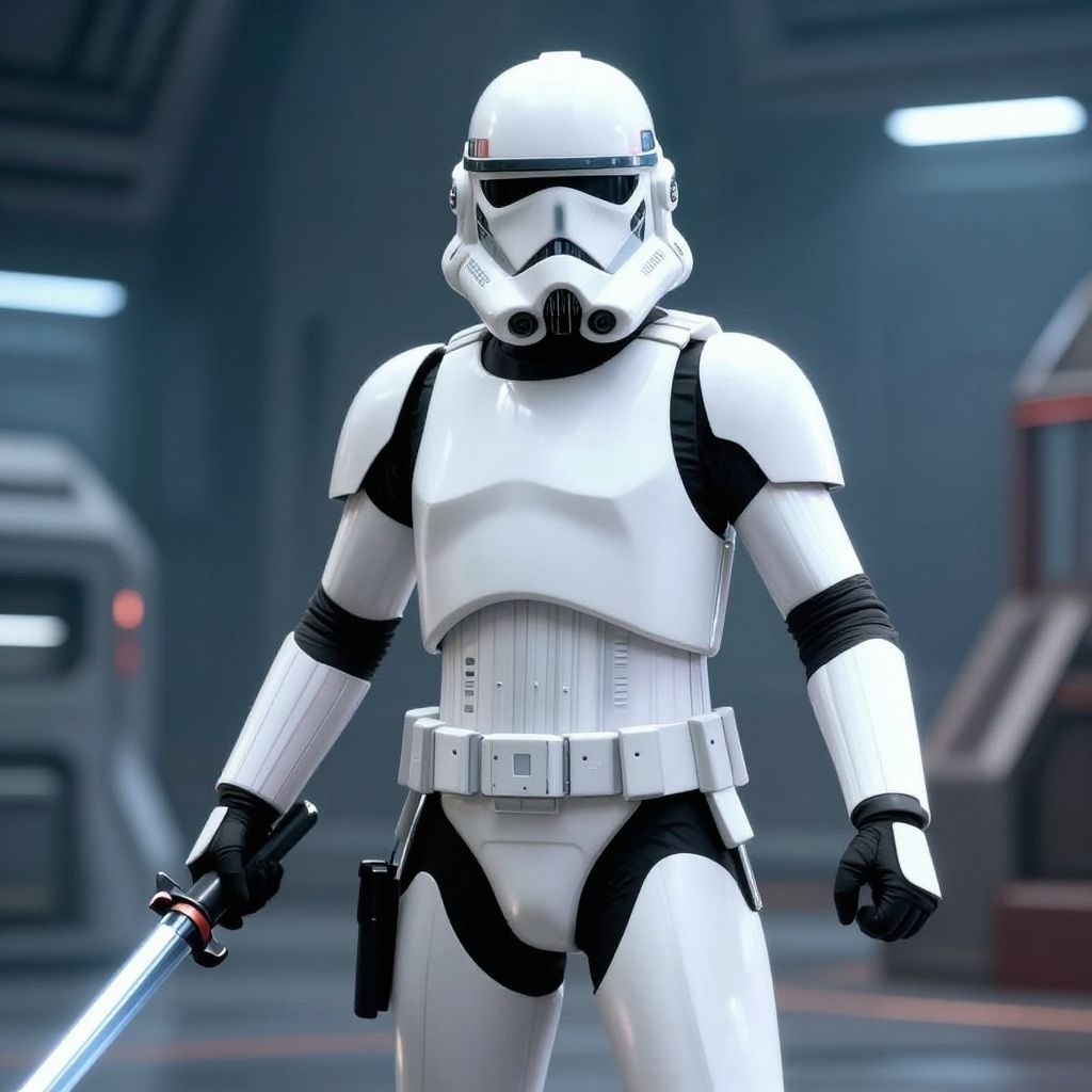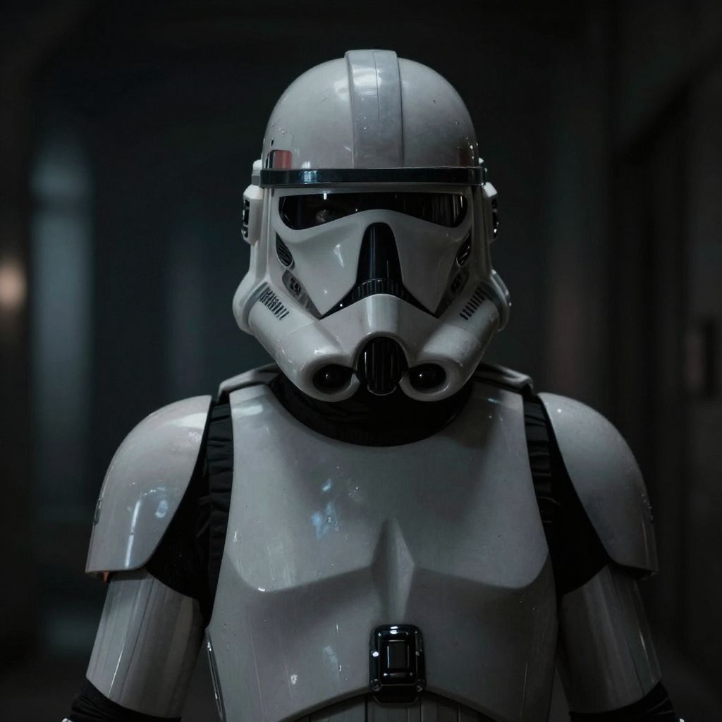 Waterfall stormtrooper with a huge amount of sandwiches, in the style of a Wes Anderson movie, cinematic, screen grab, detailed,