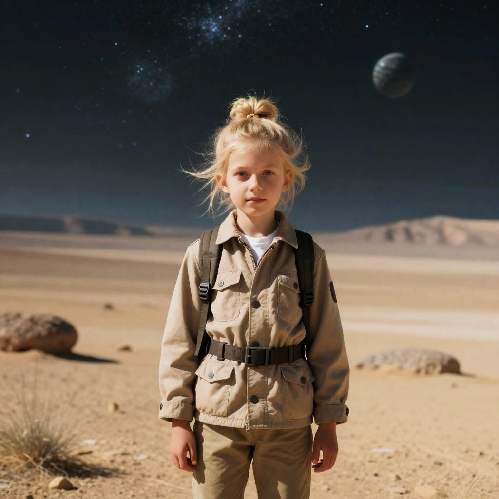 Photo RAW, (a girl in a wasteland, blonde messy bun, explorer suit, alien planet, space, starfield, kid, Alpine Meadow), masterpiece, award winning photography, natural light, perfect composition, high detail, hyper realistic