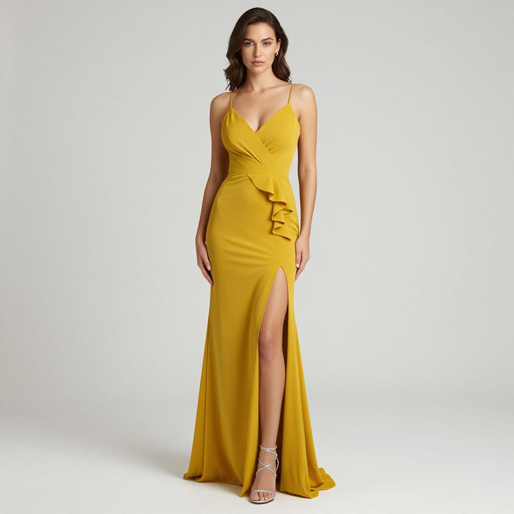 "Woman, minimalist elegance, mustard yellow gown with a fitted bodice, V-neckline, thin spaghetti straps, cascading front ruffle detail, high-waisted, thigh-high slit, floor-length skirt, strappy silver heels, white studio background.. Sexy. Pretty face and beаutiful eyes. Big breasts."