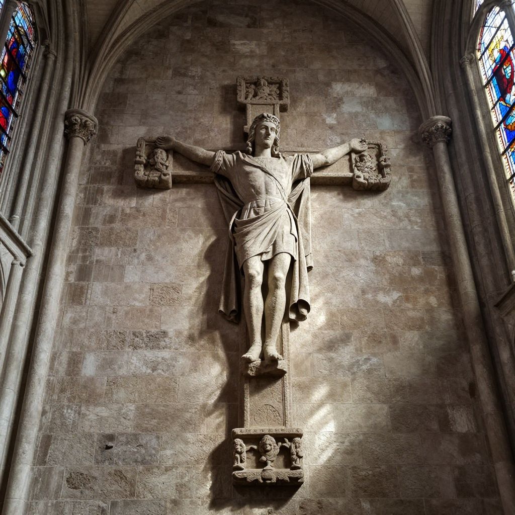 Photograph of a stone crucifix in a Gothic-style cathedral, featuring a detailed statue of a crucified Jesus with outstretched arms, adorned with a crown of thorns. Jesus wears a tattered robe, with a slight fold revealing his muscular legs. The background is a textured stone wall, illuminated by sunlight streaming through colorful stained glass windows on either side. The image highlights the shadows and light interplay, emphasizing the solemn and reverent atmosphere of the sacred space. The crucifix is mounted high on the wall, centered within the arched alcove.