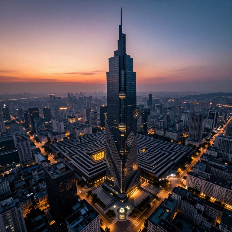 Envision a dynamic cityscape at dusk, reminiscent of Escher's intricate designs, where a colossal skyscraper arises from an elaborate maze of avenues. From a bird's eye view, gaze upon this urban panorama and marvel at the unique architecture of its futuristic metropolis, adorned with enigmatic geometric shapes and patterns that intertwine in a hypnotic ballet. The sky ignites with a spectrum of colors as daylight fades, projecting elongated shadows that prance over the city's gleaming surfaces, amplifying the complexity of the labyrinth beneath. This captivating scene stirs both awe and apprehension, beckoning viewers on an emotional odyssey through an urban realm that transcends reality, embodying the dichotomy of anticipation and trepidation in the face of the uncharted.