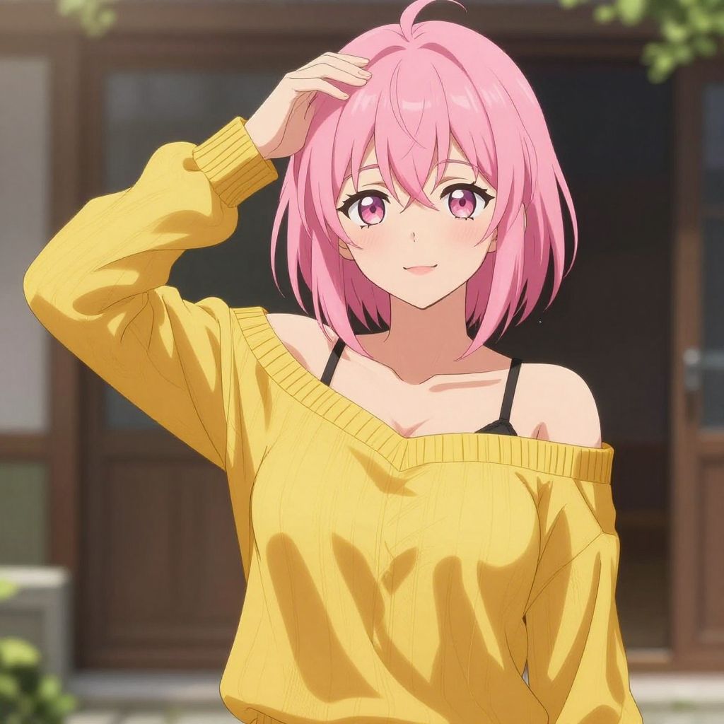Digital anime-style portrait of a pink-haired girl with short bob, wearing a yellow off-shoulder sweater, black choker, and black skirt,