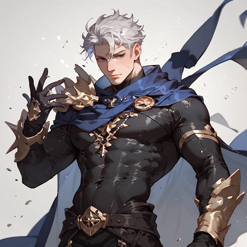 Digital artwork of an anthropomorphic fox character dressed in an elegant blue magician's suit with gold accents and a white undershirt, featuring a detailed mystical pendant. The figure has white flowing hair and a majestic golden headpiece resembling horns. The background is softly illuminated, emphasizing the character's clear eyes and extended hand gesture.