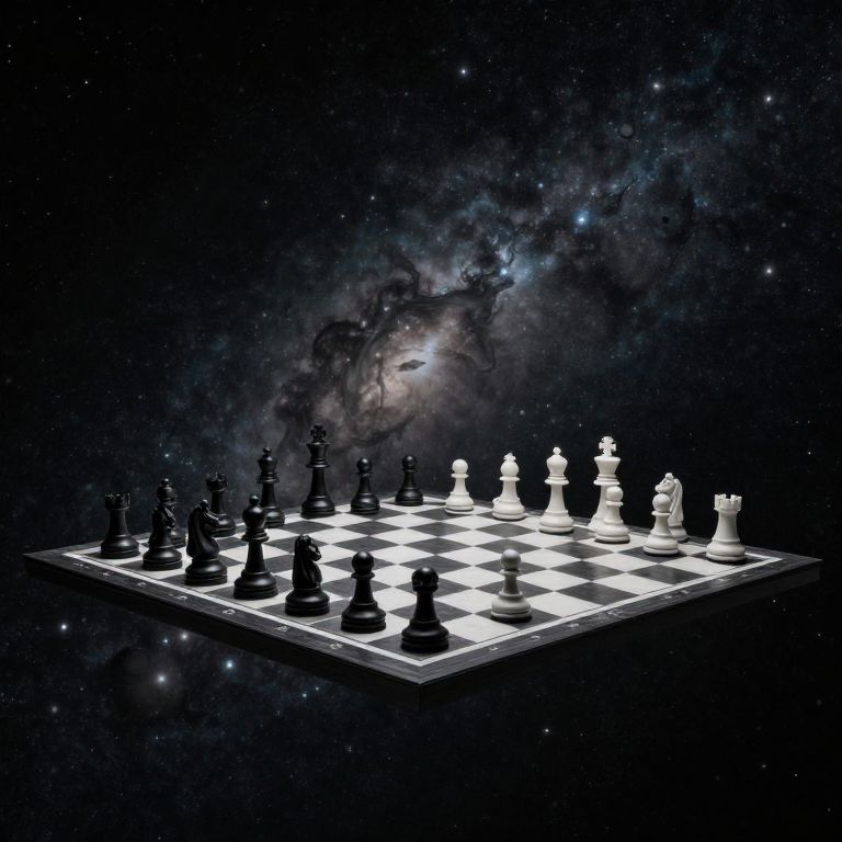 Suspended in the cosmic expanse, a chessboard of celestial dust and shadowed voids whispers an eternal game, where each piece embodies the dance of creation and destruction, evoking a profound sense of existential solitude and infinite possibility.