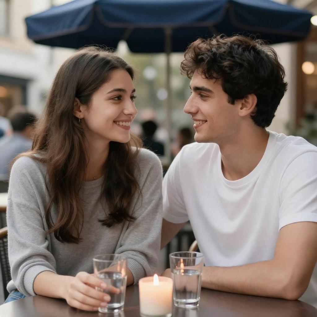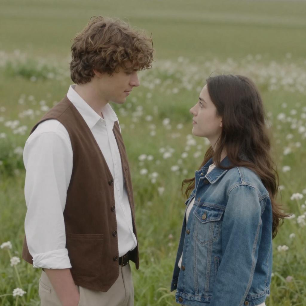Photograph of a young couple sitting on grass. The man, with curly blonde hair and a brown jacket, points at something in the woman's hand. She has dark hair, fair skin, and wears a white, puffed-sleeve dress. They are focused on the object, with a gentle, intimate atmosphere.