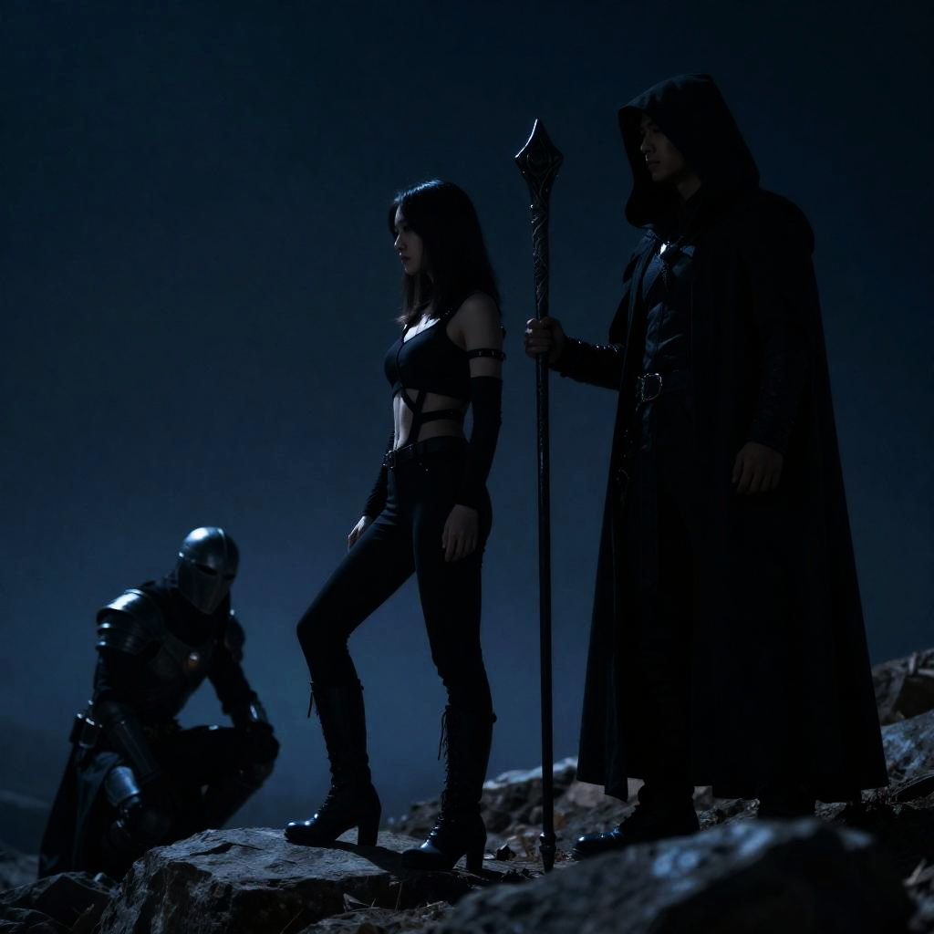 Night scene, two silhouetted figures, one in a black, form-fitting outfit with cutouts, the other in a dark, hooded cloak holding a staff. Third figure in the background, crouching, armored. Rocky terrain, dark blue sky.