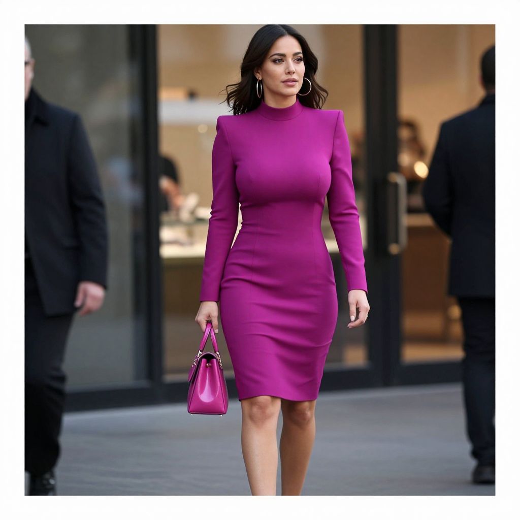 A woman, contemporary chic, magenta knee-length dress, high neckline, long sleeves, matching handbag, large hoop earrings, nude high heels, high-end shopping district, movie still, polaroid, global illumination Sexy. Pretty face and beаutiful eyes. Big breasts
