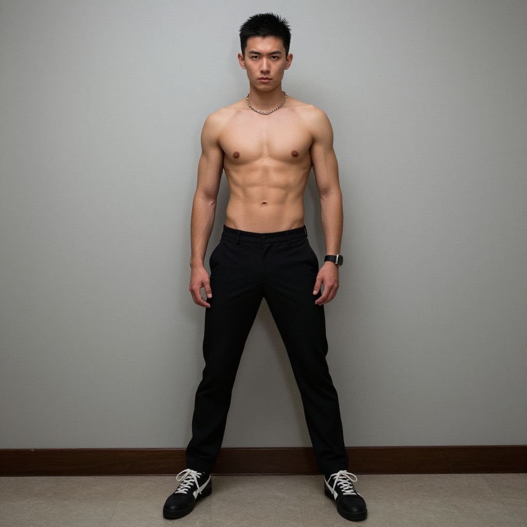 Photograph of a young, muscular Asian man standing against a plain, light gray wall. He has short, black, spiked hair and a serious expression. His chest is bare, showing defined pectoral muscles and a six-pack abdomen. He wears black pants and black sneakers with white laces. A thin gold chain necklace and a black wristwatch adorn his neck and wrist, respectively. The floor is carpeted in a neutral beige color, and the baseboard is dark brown. The lighting is even, highlighting his toned physique. The overall style is minimalistic and focused on the subject's physical form.