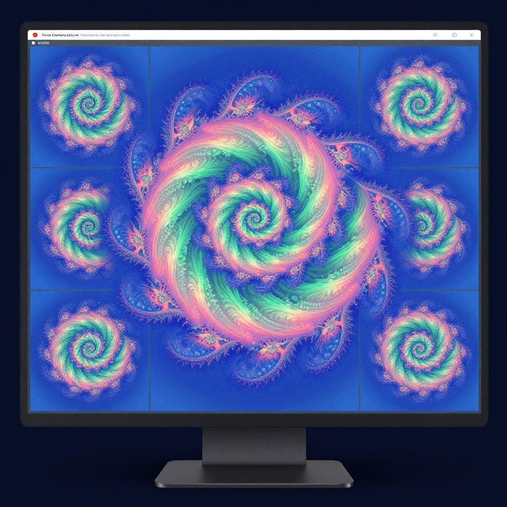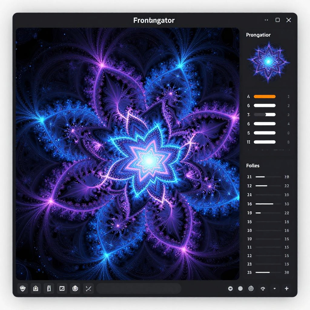 Fractal generator online interface with colorful recursive fractals forming star shapes and organic patterns, luminescent blue and purple hues, detailed UI elements with sliders and graphs, futuristic technology blend with abstract math art visuals